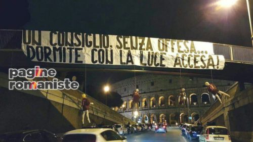 La città di Roma si sta trasformando in un cimitero a cielo aperto. Dopo la macabra scena di inizio settimana fuori Trigoria con bare e cadaveri disegnati, questa sera davanti al Colosseo sono stati impiccati dei manichini con le magliette di Daniele De Rossi, Mohamed Salah e Radja Nainggolan. Inoltre è stato affisso uno striscione intimidatorio. Questo il messaggio di minaccia da parte di alcuni tifosi laziali (GUARDA IL VIDEO CON I CORI CONTRO LA ROMA):