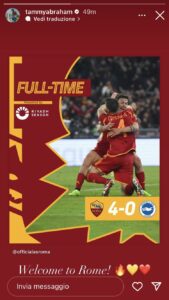 Dopo un’altra notte europea indelebile per la Roma, arrivano le prime reaction dei calciatori giallorossi, protagonisti del 4-0 al Brighton. Tammy Abraham ha condiviso la foto del tabellino del match con la scritta in inglese: “Benvenuti a Roma”.