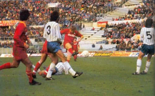 LA PARTITA – Con Paulo Roberto Falcao sugli spalti, la Roma e il pubblico sembrano subito ritrovare entusiasmo dopo il deludente pareggio per 0-0 contro il Como nella giornata precedente. Il dominio dei giallorossi, evidente sin dalle prime battute, si concretizza al 42°. Ancelotti serve l’accorrente Nela sulla sinistra, il quale mette un cross sul secondo palo dove Boniek si fa trovare pronto ed insacca. Il polacco si ripete al 59°. Dopo una serie di confusi rimpalli in area infatti, il centrocampista si avventa su una palla vagante a mezza altezza e al volo, di destro, la manda sotto l’incrocio dei pali. Passano 12 minuti e l’Atalanta subisce il tris. Questa volta è il turno di Giannini, subentrato all’infortunato Oddi, di battere il portiere Malizia con un bel tiro di esterno da fuori area. Al 78° ci pensa Pruzzo con un colpo di testa, la specialità della casa, a calare il definitivo poker che regala la vittoria alla squadra di Eriksson. Nel finale si fa male il portiere degli ospiti e Sonetti, non avendo più cambi disponibili, decide di mandare in porta il terzino destro Osti.