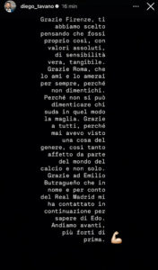 “Grazie Firenze. Ti abbiamo scelto pensando fossi proprio così, con valori assoluti di sensibilità vera e tangibile. Grazie Roma, che lo ami e lo amerai per sempre, perché non dimentichi. Perché non si può dimenticare chi suda in quel modo la maglia. Grazie a tutti, perché mai avevo visto una cosa del genere e così tanto affetto dal mondo del calcio e non solo. Grazie a Emilio Butragueno che in nome e per conto del Real Madrid mi ha contattato in continuazione per sapere di Edo. Andiamo avanti, più forti di prima”.