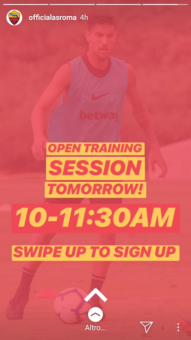 La Roma apre le porte ai propri tifosi anche in America. Come riferito su Instagram dalla stessa società, l’allenamento di domani, che si svolgerà dalle 10.00 alle 11.30 locali a San Diego (19-20.30 italiane), sarà aperto ai tifosi giallorossi (leggi qui il programma degli allenamenti). Per avere la possibilità di assistere alla seduta dei giallorossi bisognerà registrarsi su form.jotformeu.com.
