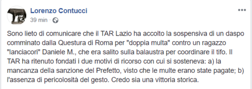 “Sono lieto di comunicare che il TAR Lazio ha accolto la sospensiva di un daspo comminato dalla Questura di Roma per “doppia multa” contro un ragazzo “lanciacori” Daniele M., che era salito sulla balaustra per coordinare il tifo. Il TAR ha ritenuto fondati i due motivi di ricorso con cui si sosteneva: a) la mancanza della sanzione del Prefetto, visto che le multe erano state pagate; b) l’assenza di pericolosità del gesto. Credo sia una vittoria storica”.