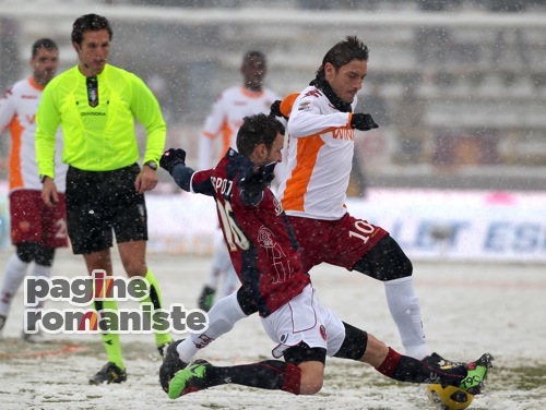 Un’evento naturale, si tratti di pioggia o neve, non è in grado di frenare la vena ironica di Francesco Totti. Il 10 giallorosso, che ha reagito con una battuta all’ipotesi di recuperare Catania-Roma domani pomeriggio (LEGGI LE PAROLE DEL CAPITANO), non è nuovo a risposte simpatiche in situazioni del genere: successe a Bologna, il 30 gennaio 2011, quando a causa della neve l’arbitro Banti si vide costretto a sospendere il match dopo soli 16 minuti di gioco, con le squadre ferme sullo 0-0. In quell’occasione Totti esclamò: “Io e Di Vaio siamo vecchi, non possiamo giocare con questo freddo. C’abbiamo un’età…”.