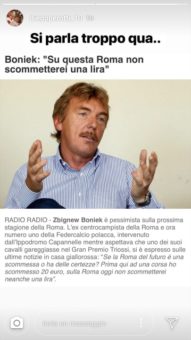 Zbigniew Boniek ha commentato il futuro della Roma ai microfoni di Radio Radio dall’Ippodromo Capannelle, queste le sue parole: “Se la Roma del futuro è una scommessa o ha delle certezze? Prima qui ad una corsa ho scommesso 20 euro, sulla Roma oggi non scommetterei neanche una lira”. Queste dichiarazioni non sono piaciute all’attaccante della Roma Diego Perotti che ha voluto dire la sua su Instagram: “Si parla troppo qua” le parole dell’argentino.
