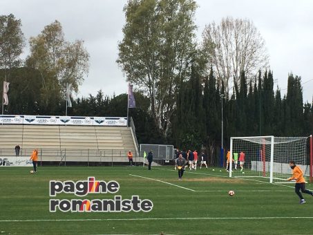 Ore 14.14 – Il riscaldamento della Roma Primavera. Risveglio muscolare con scatti e skip, torello e conclusioni in porta.