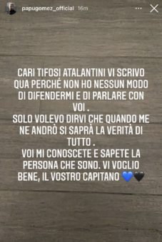 Separati in casa. Questa è la situazione in casa Atalanta. Da una parte vi è Gian Piero Gasperini, dall’altra il Papu Gomez. Dopo la lite avvenuta all’intervallo della gara con il Midtjylland, tra i due è gelo totale. Ne è una prova la scelta del tecnico di tenere il fantasista argentino in panchina nella vittoria (3-0) contro la Fiorentina. Una rottura insanabile, che porterà il capitano della Dea a partire già a gennaio. Il Papu, intanto, si rivolge ai tifosi: “Cari tifosi, vi scrivo qui perchè non ho altri mezzi per difendermi o parlare con voi. Voglio solo dirvi che, quando andrò via, saprete la verità riguardo a tutto. Mi conoscete bene, sapete che persona sono. Vi voglio bene, il vostro capitano”, il messaggio scritto su una storia di Instagram.