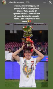 Dopo il trasferimento di Claudio Cassano al Cittadella, il giovane talento del settore giovanile giallorosso ha postato una storia su Instagram in cui ringrazia la Roma. “5 anni, un bel viaggio, un pezzo di vita. Orgoglioso di aver fatto parte di questa società . Sono sicuro di aver dato tutto. Grazie Roma, per sempre nel mio cuore”, il messaggio del giovane attaccante per i colori con cui è entrato nel mondo del calcio.