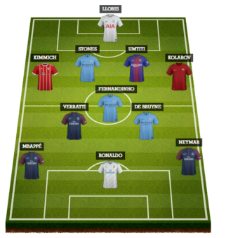 Lloris; Kimmich, Stones, Umtiti, KOLAROV; Verratti, Fernandinho, De Bruyne; Mbappè, Ronaldo, Neymar.