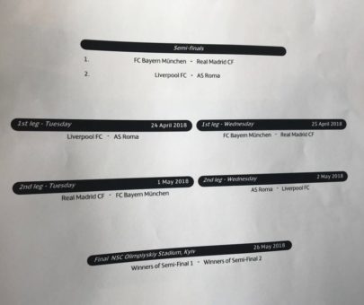 La Roma nelle semifinali di Champions League affronterà il Liverpool di Jurgen Klopp. La gara d’andata si giocherà ad Anfield il 24 aprile, mentre la partita di ritorno è in programma all’Olimpico il 2 maggio.