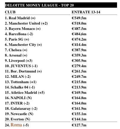 Nel rapporto annuale 2013/2014 stilato dal sito “Deloitte.com” sui club con i maggiori ricavi al mondo, comanda il Real Madrid – per il decimo anno consecutivo – con 549.5 milioni di guadagno complessivo – 231.5 mln dagli accordi commerciali, 231.5 mln da quelli televisivi. Prima in Italia la Juventus, al decimo posto, con 279.4 milioni. Fuori dalla top 20 l’AS Roma di James Pallotta, che perde ben cinque posizioni in graduatoria (al 24esimo posto).