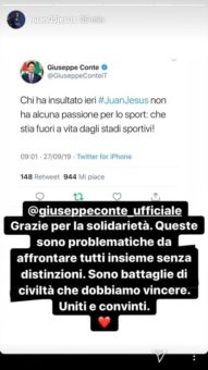Molti i complimenti arrivati alla Roma per la decisione presa nei confronti del tifoso che ha rivolto messaggi razzisti a Juan Jesus. La società, punendo l’individuo con il daspo a vita, ha mandato un messaggio molto forte, trovando consensi anche nel mondo della politica. Questa mattina il Presidente del Consiglio Giuseppe Conte e il senatore Matteo Renzi si sono congratulati con il club tramite i loro profili Twitter. “Chi ha insultato ieri Juan Jesus non ha alcuna passione per lo sport: che stia fuori a vita dagli stadi sportivi” scrive Conte, Renzi aggiunge: “Complimenti alla Roma, questa è la strada giusta”.