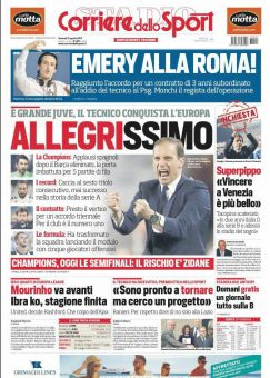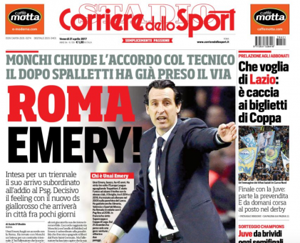 “Emery alla Roma“. Questo il titolo del Corriere dello Sport in prima pagina sul destino della panchina giallorossa. Il quotidiano romano apre con la notizia dell’arrivo del tecnico spagnolo, aggiungendo poi: “Raggiunto l’accordo per un contratto di tre anni subordinato all’addio del tecnico al PSG. Monchi chiude l’accordo con l’allenatore, il dopo Spalletti ha già preso il via. Decisivo il feeling con il nuovo ds giallorosso che arriverà in città tra pochi giorni“.