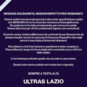 Gli ultras della Curva Nord della Lazio, hanno rilasciato un comunicato dopo gli scontri nell’agguato dei tifosi dello Stella Rossa ai danni di tifosi Romanisti a Piazza Mancini. Nel comunicato i tifosi biancocelesti non dichiarano nessuna solidarietà e vicinanza ai “cugini“, ma solo “totale indifferenza“, smentendo le voci di vicinanza da parte dei tifosi per i rivali della stracittadina: “Se qualcuno lo ha fatto privatamente, per noi non è laziale”.
