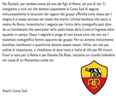 “Per Daniele, per rendere onore a uno dei figli di Roma, uno di noi. Ci rivolgiamo a tutti voi che domani popolerete la Curva Sud di seguire minuziosamente le istruzioni dei ragazzi dei gruppi affinché tutto riesca per il meglio e si possa salutare nel modo che merita l’ultima bandiera che lascia la nostra AS Roma. Innanzitutto, il segnale per l’inizio della coreografia sarà dato da un bandierone che sventolerà nella parte bassa della curva all’ingresso delle squadre in campo. Dopo il segnale si prega di non alzare altro che non sia il materiale coreografico fornito appunto dai gruppi. Per cui, almeno inizialmente, bandiere, bandieroni e quant’altro devono essere riposti. Infine, ma non per ordine d’importanza, vi chiediamo di dare tutto a livello di tifo per 90 minuti. Fuori la voce per la Roma e per Daniele De Rossi, lasciamo un ricordo indelebile nel cuore di un romanista come noi. Avanti Curva Sud”.