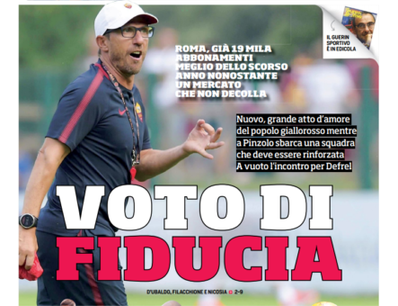 Corriere dello Sport (G.D’Ubaldo) – Di Francesco subito protagonista. Detta le regole nello spogliatoio e mette in riga un tifoso, che reclama rispetto, nel primo giorno di ritiro della nuova Roma. Un uomo sui quaranta anni ha urlato da lontano al nuovo allenatore giallorosso: «Parlate di senso di appartenenza e neanche salutate, io sono qui con il bambino da questa mattina e nessuno risponde». A dire il vero la Roma al mattino ha lasciato Trigoria e ha raggiunto Pinzolo solo alle diciotto. Nel momento in cui ha sentito quella voce isolata, Di Francesco si è avvicinato alla rete di recinzione del terreno e garbatamente ha riposto al tifoso: «Stai facendo uno show. Perdonami, ma i ragazzi quando entreranno in campo all’inizio dell’allenamento vi saluteranno e io già l’ho fatto. Vuoi gestire tu quello che devono fare i ragazzi? Vuoi gestire tu la Roma calcio? Vieni a parlare di rispetto. Che cos’è il rispetto? Rispetto vuol dire venire a dare la mano uno ad uno ai tifosi? Sai cosa non mi piace? Che stiamo dando tanto clamore a una situazione di poco conto. Stiamo facendo veramente uno show. E se vieni a parlare a me di senso di appartenenza hai sbagliato persona». A Eusebio Di Francesco non mancano certo la personalità e neanche l’educazione. E’ riuscito a gestire con semplicità una situazione che sarebbe potuta diventare imbarazzante.