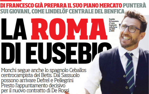 IL SUO CALCIO – Di Francesco non cambierà le sue idee neppure alla guida di un grande club. A Eusebio piace lavorare con i giovani, sa che la Roma punterà sulla linea verde come vuole Pallotta. Ha saputo valorizzare Pellegrini, che considera un giocatore in prospettiva da Nazionale. Ha ancora ampi margini di crescita. Nella rosa della Roma ci sono molti giocatori che stima e che in questa stagione gli hanno dato solo dispiaceri, con due sconfitte nelle due partite disputate. Di Francesco lavora molto sul campo, la preparazione tattica è alla base del suo lavoro. Gli piacciono esterni d’attacco veloci come Salah, Perotti ed El Shaarawy, che nel suo calcio dovranno cercare continuamente la profondità, aggredire le linee avversarie, saranno loro i destinatari principali delle verticalizzazioni. De Rossi avrà un ruolo importante anche con lui: il centrocampista che si abbassa per proteggere la difesa. I centrocampisti centrali fanno un pressing molto alto, avanzando a volte anche fino al livello degli attaccanti. E’ il modo di giocare che predilige Strootman, al quale la Roma vuole rinnovare il contratto. Di Francesco ama impostare l’azione già con i centrali difensivi, che devono essere abili tecnicamente. La ricerca di Monchi è indirizzata in questo senso.