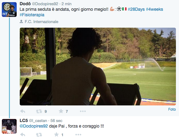 Dodò ha già concluso la sua prima stagione da interista: il laterale brasiliano è stato operato un mese fa all’Istituto Clinico Humanitas di Rozzano. L’intervento chirurgico di meniscectomia mediale e revisione del legamento crociato del ginocchio sinistro era perfettamente riuscito. Ora il laterale brasiliano ha iniziato la prima seduta di fisioterapia, postando una foto degli esercizi sul proprio profilo Twitter. Leo Castan, difensore della Roma e legatissimo all’ex compagno, lo ha rincuorato: “Daje Pai, forza e coraggio!!!”.