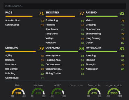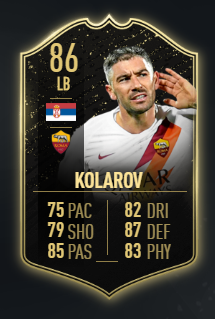 La sua stagione videoludica è cominciata con una valutazione di 82 ma ci ha messo un amen per far salire il suo overall a 84. Una carta già solida, un terzino che non ha molta velocità di base, ma che ha una difesa sufficiente per farlo essere uno dei migliori della Serie A. Il punto forte è sicuramente il tiro: si parte da 74 per l’oro raro fino ad arrivare a 79 per il SIF (Second In Form). Su FIFA 20 lo sprint è alla base di tutto e per questo Kolarov può essere utilizzato anche come centrocampista. Le statistiche ci sono tutte: 85 di passaggio, 82 di dribbling, 87 di difesa per chiudere con 83 di fisico, parlando sempre dell’ultimo upgrade uscito, quello consigliato da usare anche per il costo, poco più di 20mila crediti.