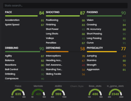 89 di overall con valori decisamente importanti per mettere il nostro Pastore dietro le punte. La velocità è dove il piatto piange, ma a quello ci siamo abituati. El Flaco non fa dello sprint la sua arma migliore, anche se 84 non è un valore da disprezzare. Si sale di colpi nel tiro dove troviamo un buon 87. Il tutto si completa con 93 di potenza tiro e 93 di tiri al volo che vanno a cozzare con un 83 di finalizzazione che non è il massimo. Il top di Pastore lo troviamo nel passaggio (90) e nel dribbling (90). Nella prima voce sensazionale il passaggio corto con 95 e l’effetto con 91. Nella seconda tutto ciò che riguarda i gesti col pallone è al top: controllo 95, dribbling puro 90, freddezza 90. Anche l’agilità ad 87 è un ottimo punto a suo favore. Difesa e fisico da non calcolare. L’80 di stamina ce lo mette al sicuro se non lo faremo rientrare in difesa. Lo stile intesa consigliato è “cacciatore” per la velocità oppure “motore” per aumentare anche l’agilità e l’equilibrio.