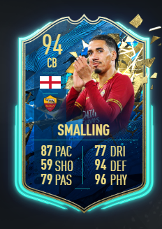 Le sue prestazioni sono state sempre di grande livello e questo si è poi confermato in FIFA 20 dove il centrale ha ottenuto una carta “In Form” 83 ed una “Headliner” 85 che non ha ottenuto alcuna evoluzione visto che il campionato si è fermato impedendo, al momento, alla Roma di centrare 4 vittorie cosecutive e a Smalling di prendere, magari, un’altra carta IF. La “toppa” arriva con la versione per eccellenza, quella di fine stagione anche se fine non è: il TOTS.