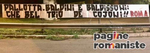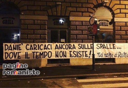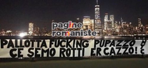 Pagine Romaniste – Continua senza sosta la contestazione dei tifosi della Roma per l’addio forzato di Daniele De Rossi. Nella notte è apparso uno striscione – a firma Nel nome di Roma – sotto casa del capitano giallorosso: “Daniè caricaci ancora sulle spalle… Dove il tempo non esiste!”. Ma quello esposto sotto l’abitazione della bandiera romanista non è l’unico ad essere stato notato: anche a New York infatti è apparso uno striscione contro il presidente James Pallotta: “Pallotta f***ing pupazzo, ce semo rotti er ca**o!”. Non è mancato anche il disappunto verso Baldini e Baldissoni, questa volta lo striscione porta la firma del Gruppo Roma: “Pallotta, Baldini e Baldissoni: che bel trio de cojoni!”.