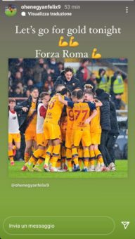 La Roma si appresta ad affrontare la grande sfida contro l’Inter di Simone Inzaghi e lo farà con qualche defezione. Tra i giallorossi oltre agli infortunati Pellegrini ed El Shaarawy e agli squalificati Abraham e Karsdorp, dovrà fare a meno di Felix Afena Gyan risultato positivo al Covid-19. Il match-winner della gara contro il Genoa ha voluto incitare i compagni su Instagram condividendo una storia: “Andiamo a prenderci l’oro (i tre punti) stasera. Forza Roma”