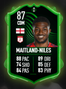 87 di overall e una posizione in campo tutt’altro che scontata e che per una full Roma può fare gola. Maitland-Niles è piazzato come CDC, quindi per agire da mediano. Le caratteristiche e i valori ci sono tutti e sono molto competitivi. Si può giocare davanti alla difesa o mezzala grazie al workrate medio/medio. Al tiro non ci può andare avendo soltanto 68 di finalizzazione, ma il resto lo fa più che bene. 88 di velocità per un centrocampista è altamente competitivo, così come il passaggio (90 di corto) e il dribbling vista l’alta agilità . Perfetto per i contrasti in piedi, quelli che vanno per la maggiore in questo gioco, meno per l’aggressività . 80 è un valore medio, quindi non sarà un giocatore prettamente automatico come movimento (come i vari Kante etc).