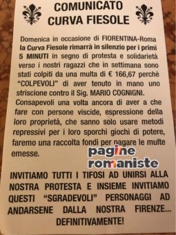 Ore 13.10 – Volantinaggio di un comunicato della Curva Fiesole da parte dei tifosi viola per protestare contro le multe. I tifosi rimarranno in silenzio per i primi 5 minuti.