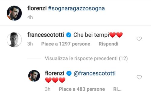 Nel corso della giornata Alessandro Florenzi aveva pubblicato alcune foto sul suo profilo Instagram, una delle quali lo ritraeva con Francesco Totti nel giorno del suo esordio in Serie A, quando entrò proprio al posto dell’ex numero 10. Dopo i commenti di Nicolò Zaniolo e Lorenzo Pellegrini, è arrivato anche quelli di Totti, che ha scritto: “Che bei tempi“.