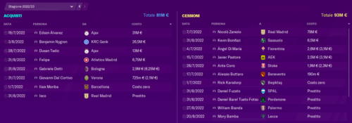 Pagine Romaniste (L.Fantoni) – I festeggiamenti per lo Scudetto (Ep.6) sono andati avanti per settimane. L’unico a non festeggiare, impegnato a pensare da subito a costruire una squadra ancora più competitiva è stato Gianluca Petrachi. Il direttore sportivo si è liberato di ingaggi pesanti come quello di Pastore (venduto per 3 milioni all’AEK Atene), Di Maria (3 milioni alla Fiorentina), Coric (2.3 allo Stoke) e Karsdorp (parametro zero al Besiktas). Se ne è andato anche Bonifazi, acquistato solamente 6 mesi prima, per 6.5 milioni al Sassuolo. La cessione più dolorosa però è quella di Nicolò Zaniolo che aveva il desiderio di mettersi in luce in un’altra piazza ed è stato accontentato, venendo ceduto al Real Madrid per 79 milioni di euro. Per sostituire il gioiello italiano, proprio dai galacticos arriva in prestito gratuito Francisco Romà n Alarcòn Suà rez, conosciuto ai più come Isco. Il colpo è di quelli epocali. Insieme a lui a parametro zero arriva un giovane del Barcellona dal talento potenzialmente da pallone d’oro. Si tratta di Ilaix Moriba, un centrocampista centrale di 19 anni che in blaugrana faticava a trovare spazi. Vengono acquistati anche il difensore Felipe dell’Atletico Madrid (6.75 milioni), Dusan Tadic e il promettente difensore centrale Edson Alvarez dall’Ajax (13 e 31 milioni). Dal Genk arriva per 26.5 milioni il promettente trequartista svedese Nygren e anche un altro paio di giovani, ma ad un prezzo molto più contenuto: Gabriele Dotti dal Bologna e Giovanni Dal Cortivo dal Verona.