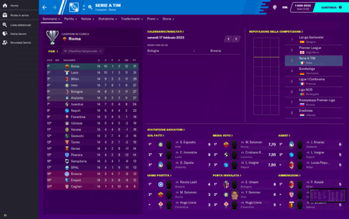 Il 2022 è l’anno del Mondiale in Qatar che si svolge in inverno e, per forza di cose, modifica non poco i calendari. La competizione internazionale la vince la Spagna in una finale strana contro l’Austria, dominata per 4-0. Il cammino dell’Italia si interrompe al secondo turno con la sconfitta contro il Messico (2-1 con gol di Pellegrini). In Serie A, quindi, si sono giocate solamente 14 partite ma la Roma riprende da dove aveva interrotto, al primo posto in classifica. Al debutto, contro la Sampdoria arriva un 2-0 firmato dai due centrali difensivi: Edson Alvarez e Ruben Vezo. Poi ne arrivano altre 4 di vittorie, tra cui quella in trasferta sul campo del Milan grazie alle reti di Moriba e Cristante. Le uniche sconfitte arrivano con Brescia, Genoa e Juventus. Pareggio esterno con l’Inter (ancora gol di Moriba) e poi tutte vittorie. Quasi superfluo dire il risultato del derby: la Roma si impone per 2-1 grazie alle reti di Edson Alvarez e Tadic. Per la Lazio invece a segno ci va Ceballos, vecchia conoscenza giallorossa. La squadra di Fonseca è, come dicevamo, prima in classifica, ma appaiata con lei, allo stesso numero di punti, c’è anche la Lazio. Seguono poi, distanti di qualche lunghezza, Inter e Milan. Solo settima la Juventus. Il capocannoniere per ora è Sebastiano Esposito con 9 gol. Il romanista Manor Solomon è il miglior giocatore del campionato per media voto (7.70). La strada per il secondo scudetto consecutivo è ancora lunga ma per ora la Roma è sulla retta via.