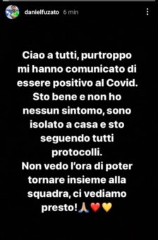 Daniel Fuzato è risultato positivo al Covid-19 a seguito dei tamponi molecolari effettuati nella giornata di ieri. Il portiere, vaccinato, lo ha annunciato attraverso una storia su Instagram con queste parole: “Ciao a tutti, purtroppo mi hanno comunicato di essere positivo al Covid. Sto bene e non ho nessun sintomo, sono isolato a casa e sto seguendo tutti i protocolli. Non vedo l’ora di poter tornare insieme alla squadra, ci vediamo presto“.