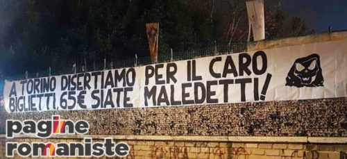 Il gruppo organizzato del tifo romanista, i Fedayn, ha comunicato che non prenderà parte alla trasferta di Torino con uno striscione apparso vicino allo stadio che recita: