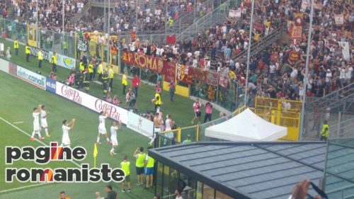 Pagine Romaniste (F.Biafora – Y.Oggiano) – Dopo l’importante vittoria sul difficile campo dell’Atalanta, i giocatori della Roma hanno festeggiato sotto al settore ospiti occupato dai tifosi arrivati in massa dalla Capitale. In particolare De Rossi e Dzeko hanno lanciato sugli spalti le maglie e i calzoncini da gara. Ai tifosi che chiedevano ulteriori indumenti ai giocatori, il centravanti bosniaco ha simpaticamente risposto mimando di non poter spogliarsi ulteriormente, o sarebbe rimasto nudo.