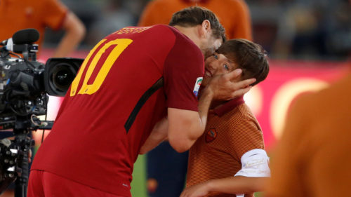 La Repubblica (F.Bocca) – La lunga notte dei cuori spezzati, degli addii, delle lacrime, e dei lucciconi si è conclusa con un gesto simbolico. Totti a centrocampo si è avvicinato a un giovane bambino, Mattia Almaviva – 11 anni, capitano di una delle squadre nati 2006 della Roma – che poteva essere benissimo lui ai tempi della Smit Trastevere 30 anni fa, si è tolto la fascia di capitano e gliel’ha stretta intorno al braccino minuto. Lo ha baciato, accarezzato e sostanzialmente ha consegnato così la Roma al futuro, lasciando un patrimonio di talento straordinario ma anche difficile, se non impossibile da trasmettere. I giocatori della Roma più vicini a Totti, “i romani e romanisti” come lui, hanno sentito particolarmente il distacco. De Rossi, che un tempo fu Capitan Futuro, ha abbracciato l’amico di sempre e tutta la sua famiglia, piangendo sulla sua spalla. Florenzi, che pochi anni fa era solamente un cucciolo e adesso soffre gli infortuni e gli imprevisti del mestiere, se lo è abbracciato come un fratello maggiore che ti consegna la famiglia nelle mani. «Ci sei sempre stato e ci sarai sempre» gli ha detto. Lacrime, lacrime per tutti. L’addio di Totti, l’ultimo tocco di pallone registrato alle 19.59 di domenica 28 maggio 2017, è avvenuto all’interno di una partita, vera, di grande batticuore. Anzi addirittura da infarto per i 60 mila romanisti tornati per una volta a riempire lo stadio Olimpico. Il Genoa ha rischiato di fare un piccolo bis del famoso Roma-Lecce 1986. La Roma ha corso seriamente il pericolo di lasciare il secondo posto a un Napoli ben più affamato e determinato, deciso a cogliere l’occasione di un Genoa dispettoso e affatto disposto a fare l’agnello sacrificale. Ci sono volute le classiche sette camicie per rimontare e superare i gol shock di Pellegri e Lazovic.