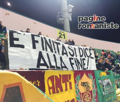 Pagine Romaniste – I tifosi della Roma non mollano la squadra e non mollano l’idea delle rimonte contro Lione e Lazio e chissà, anche quella sulla Juventus. Proprio su questo, al Barbera, è comparso uno striscione che recita: “E’ finita si dice alla fine!“, sintomo che il popolo giallorosso crede alle imprese.
