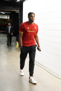 La Roma conquista cuori in tutto il mondo. Questa volta ad essere immortalato con la maglia giallorossa è Nesmith, cestista dei Boston Celtics. Classe 99′, viene selezionato al Draft NBA 2020 con la quattordicesima scelta assoluta dai Boston Celtics. La squadra di Boston sfida mercoledì 4 maggio 2022 il Milwaukee e proprio prima della sfida Aaron Nesmith, come si vede nello scatto, ha indossato la maglia della Roma.