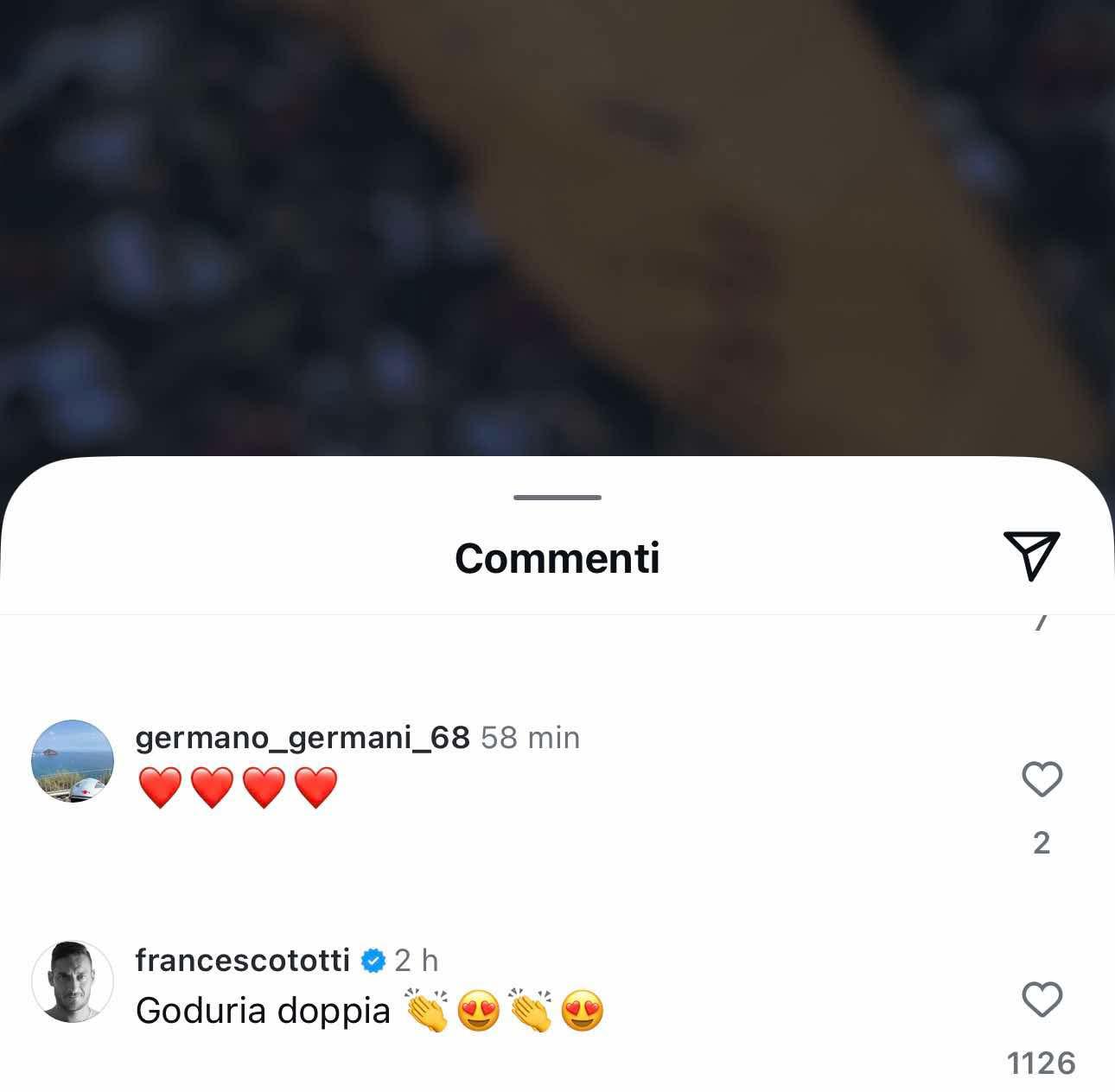 Un colpo preciso, un sinistro nell’angolino che ha spento le speranze biancocelesti e acceso i cuori dei tifosi romanisti. Ma la gioia non finisce in campo: a rendere questa vittoria più speciale è stato il plauso social di Francesco Totti, che ha commentato il post Instagram del centrocampista con un semplice ma iconico “Goduria doppia”.