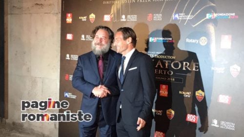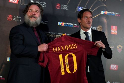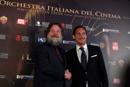 Pagine Romaniste (dal Colosseo E.Bandini) – Una giornata particolare che evoca bei ricordi. Nel parco archeologico del Colosseo va in scena “Il Gladiatore – il concerto” con tanti ospiti d’eccezione, per un evento benefico a favore del programma ‘End Polio Now’. Per la società giallorossa presente Francesco Totti, che si è fatto delle foto anche con la direttrice del Colosseo assieme al direttore generale Mauro Baldissoni, al team manager Morgan De Sanctis e al responsabile della comunicazione Guido Fienga. Special guest, naturalmente, l’attore neozelandese del famoso film diretto da Ridley Scott, Russell Crowe che, dopo aver ricevuto la maglia numero 10 autografata con su scritto ‘Maximus’, ha rilasciato alcune dichiarazioni a proposito dell’ex numero dieci giallorosso, che ha poi prontamente risposto in un simpatico siparietto. Queste le dichiarazioni: