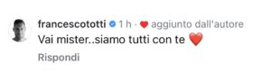 Ieri è arrivata l’ufficialità da parte della Roma del rinnovo di contratto di Daniele De Rossi fino al 2027. Tantissimi sono stati i messaggi per DDR, da parte dei tifosi giallorossi e di ex giocatori, uno in particolare è stato degno di attenzione, quello di Francesco Totti: “Vai mister… siamo tutti con te” ha commentato Er Pupone.