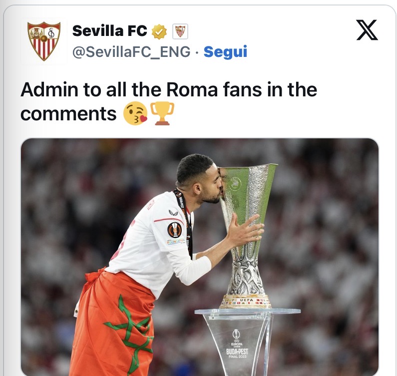 A quel punto il club andaluso ha deciso di intervenire direttamente, provocando i sostenitori romanisti. L’account del Siviglia ha infatti risposto pubblicando l’immagine di Youssef En-Nesyri mentre bacia il trofeo, accompagnata dalla didascalia: “Dedicato dall’admin a tutti i tifosi della Roma nei commenti”. Un messaggio ironico che ha inevitabilmente riacceso la rivalità social tra le due tifoserie, riportando al centro dell’attenzione la finale disputata alla Puskás Aréna.
