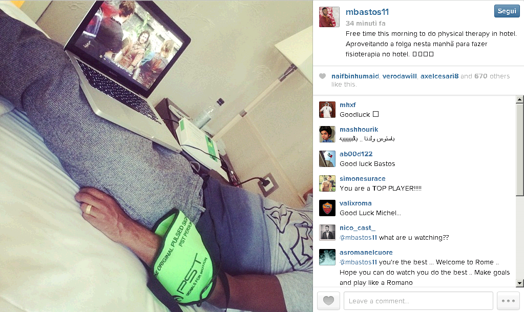 Michel Bastos, uno degli ultimi acquisti della Roma nel mercato di gennaio, ha approfittato della mattinata libera per svolgere delle terapie fisiche in Hotel. “Free time this morning to do physical therapy in hotel (Tempo libero questa mattina per fare terapia fisica in hotel)”, il post del francese sul proprio profiloInstagram.