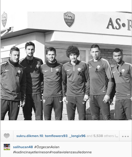 In Turchia una ragazza universitaria è stata stuprata, uccisa e gettata in un lago. Qualche ora più tardi è nato l’ hashtag “contro la violenza sulle donne” e Salih Uçan ha voluto aderire a questa “campagna” social chiedendo ai compagni di partecipare con lui. Questa la foto postata sul profilo Instagram del centrocampista turco, nella quale i giocatori della Roma posano con un fiocco nero sulla tuta d’allenamento.