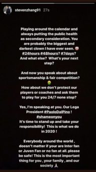 “Giocate con il calendario e mettete sempre la salute pubblica come considerazione secondaria. Siete probabilmente i più grandi e cupi clown che abbia mai visto. Cos’altro? Quale sarà il vostro prossimo passo? E ora parlate di fair play e sportività? Si, sto parlando con te. Il nostro presidente della Lega Paolo dal Pino #shameonyou. E’ tempo di alzarsi e prendere le vostre responsabilità. Questo è quello che facciamo nel 2020. A chiunque nel mondo: non importa se sei fan dell’Inter, della Juventus o non sei fan. Per favore, state attenti. E’ la cosa più importante per voi, la vostra famiglia e la nostra società”.