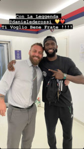 Antonio Rüdiger e Daniele De Rossi di nuovo insieme. Dopo la fine della partita tra Italia e Germania, prima sfida del gruppo 3 di Nations League, il difensore del Real Madrid e l’ex capitano della Roma si sono incontrati negli spogliatoi. Il centrale teutonico ha immortalato il momento, poi condiviso sui social tramite una storia su Instagram: “Con la leggenda. Ti voglio bene frate!!“, le affettuose parole di Rüdiger.
