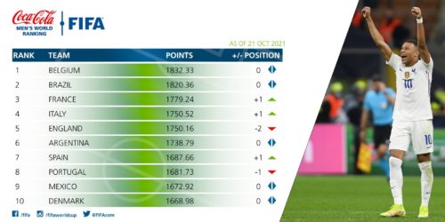 Finalmente è ufficiale. L’Italia, dopo aver vinto l’Europeo e aver fatto punti importanti per le qualificazioni ai Mondiali in Qatar, è salita al quarto posto del Ranking FIFA per nazionali. I ragazzi di Mancini superano di mezzo punto l’Inghilterra battuta a Wembley lo scorso 11 luglio. Al primo posto sempre il Belgio tallonato dal Brasile. Più staccata la Francia. Tra le top 10 anche Messico e Danimarca.