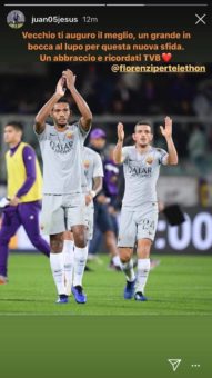 Dopo Zaniolo anche Juan Jesus ha voluto salutare Alessandro Florenzi. Il brasiliano, tramite una storia sul proprio profilo Instagram, ha salutato il classe ’91 con un bel messaggio. Queste le sue parole: