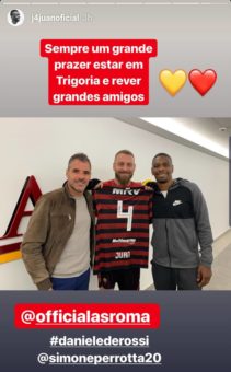 Il centrale ha poi regalato la sua ultima maglia, quella del Flamengo, a Daniele De Rossi lasciando una didascalia sul proprio profilo Instagram: “Sempre un piacere tornare a Trigoria e rivedere grandi amici”.