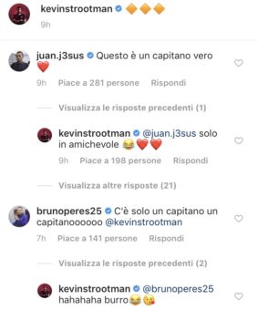 Scherzi e risate sui social tra compagni di squadra. I brasiliani Bruno Peres e Juan Jesus hanno infatti ironizzato sul fatto che Kevin Strootman ieri sera abbia indossato la fascia di capitano dell’Olanda, nella sfida amichevole con la Slovacchia. Il terzino ha lasciato un commento sotto la foto pubblicata dall’olandese su Instagram: “C’è solo un capitano“. Mentre il centrale mancino si è così espresso: “Questo è un capitano vero“. Subito pronta le risposta ironica del centrocampista: “Solo in amichevole”.