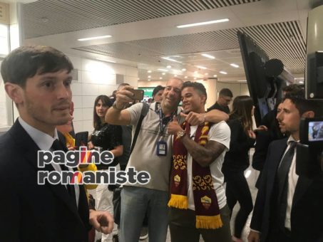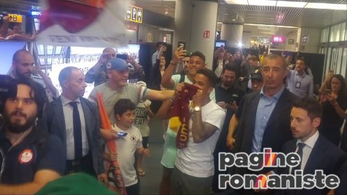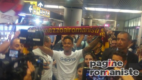 Ore 23.35 – Super accoglienza per l’olandese all’uscita dal gate. I supporter intonano cori che inneggiano al suo nome. Il calciatore risponde baciando lo stemma della Roma sulla sciarpa.